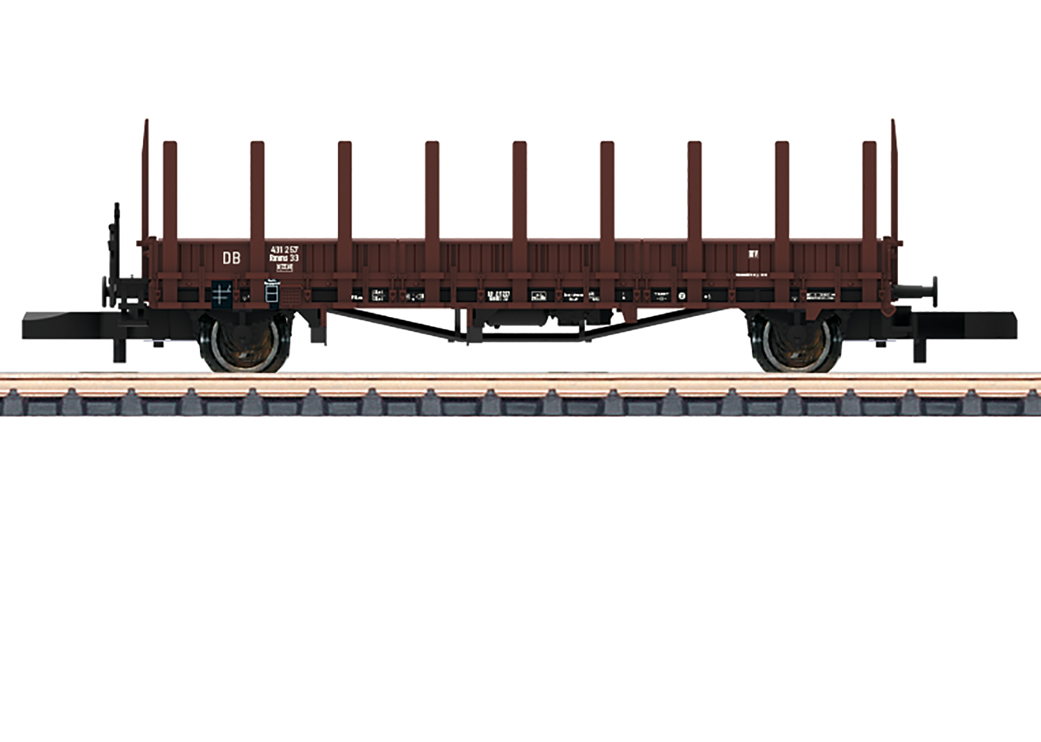 Prototype: German Federal Railroad (DB) type Rmms 33 stake car as it looked in Era III. Reproduction of a car with a handbrake platform. air brakes. wooden sides. and wooden stakes. Model: The car is completely new tooling and is made of plastic. The imitation brake shoes are lined up with the wheel treads. The car is finely painted and lettered. Removable stakes are included. Length over the buffers 65 mm / 2-9/16.