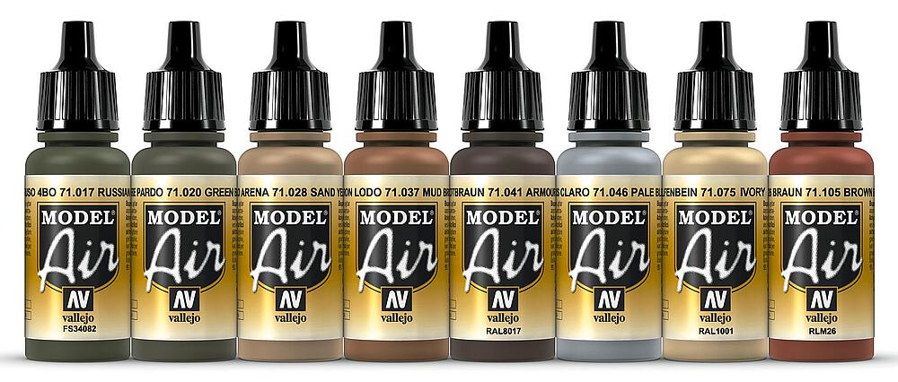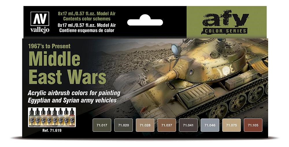 Farb-Set mit 8 Fläschchen à 17 ml. Farbschemen Kriege Mittlerer Osten von 1967 bis heute. Je 1 x 71017, 71020, 71028, 71037, 71041, 71046, 71075, 71105.