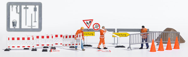 3 Straßenbauarbeiter in Arbeitskleidung der Epoche V. Mit verschiedenen Absperrungen, passenden Verkehrsschildern, Pylonen, Sandhaufen und Straßenbau-Werkzeugen.