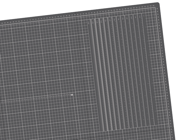 Aufgedruckt sind außerdem verschiedene Winkel, Formen in diversen Größen und Modellbau Maßstäbe