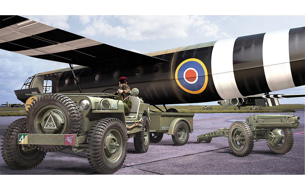 Plastikmodellbausatz eines US-amerikanischen WWII Jeeps mit Anhänger und Kanone. Starter-Set, einfach zu bauen. 71 Teile sowie 4 Farben, Kleber und ein Pinsel.
