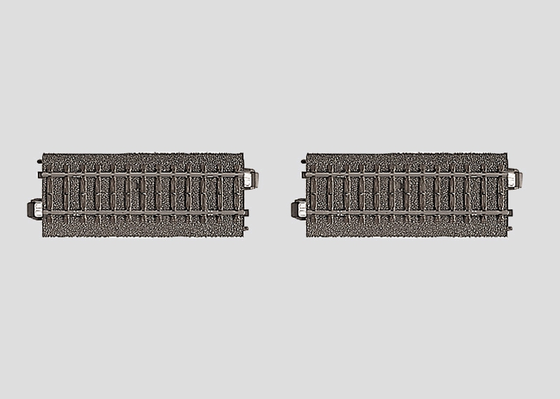 2 gerade Gleise 94.2 mm. Dauerkontakt über Radsätze. Mit isoliertem Schienenabschnitt zur Gleisbesetztmeldung beim Überfahren. Verlängerung mit geraden oder gebogenen Gleisen.