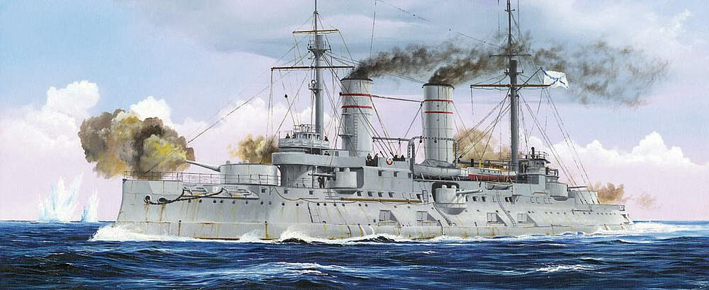 Plastikmodellbausatz eines russischen Kriegsschiffes aus den 1900er Jahren mit über 390 Teilen und Photoätzteile und Ständer. Länge gebaut 338,6 mm /Durchmesser 66,4 mm.