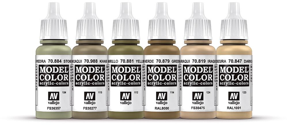 Farb-Set für den Table-Top-Games-Bereich, Wüstentarnung deutscher und britischer Infanterie, WWII. Beinhaltet je 1 x 17 ml der Farben 70847, 70819, 70879, 70881, 70988, 70884.
