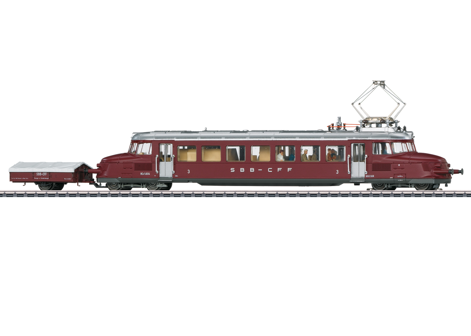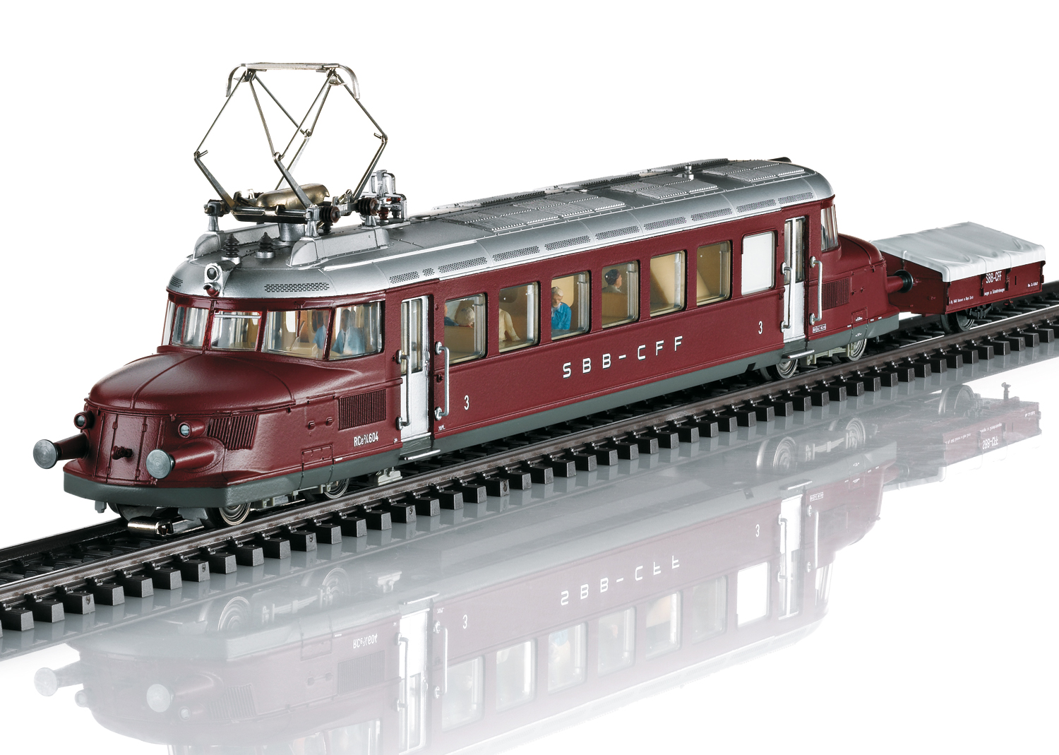 Modèle réel : Automotrice électrique rapide série RCe 2/4 Roter Pfeil (fléche rouge). 3e classe. des chemins de fer fédéraux suisses (CFF). avec remorque à ski à deux roues. Livrée de base pourpre. Numéro d’immatriculation de l’automotrice : 604. État de service vers 1948. Modèle réduit : Avec décodeur numérique mfx+ et nombreuses fonctions sonores. Motorisation régulée haute performance. Moteur spécial avec volant d’inertie et arbre à cardans pour bogie moteur. 2 essieux moteurs. Bandages d’adhérence. Fonction permanente du fanal à trois feux et du feu blanc de fin de convoi – inversion en fonction du sens de marche – en mode d’exploitation conventionnel. sélection possible en mode numérique. En outre. possibilité de commuter sur un feu de fin de convoi rouge. Éclairage intérieur intégré de série. Fanal et éclairage intérieur assurés par diodes électroluminescentes blanc chaud et rouges sans entretien (LED). L’automotrice est équipée de série de figurines représentant le conducteur ainsi que de nombreux voyageurs. Les touches de fonction permettent de déclencher en plus divers bruitages d’ambiance. Remorque à skis à deux roues attelée à l’automotrice avec attelage spécial correspondant.Longueur totale h.t. 31.5 cm.