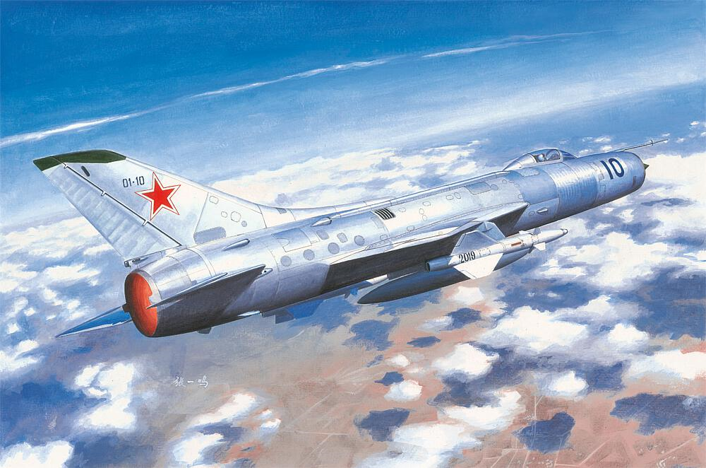 Plastikmodellbausatz eines sowjetischen Abfangjägers aus den 1960er Jahren mit 100 Teilen. Länge gebaut 209,7 mm / Flügelspannweite 84,3 mm.