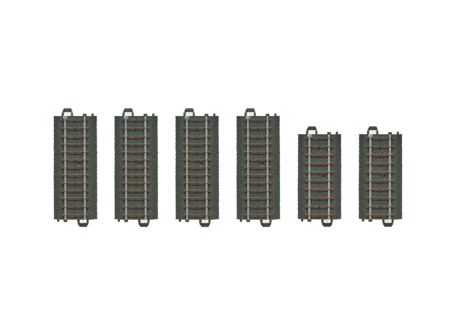 Gleis-Set bestehend aus 4 geraden Gleisen 24094 (je 94.2 mm lang) und 2 geraden Gleisen 24077 (je 77.5 mm lang).