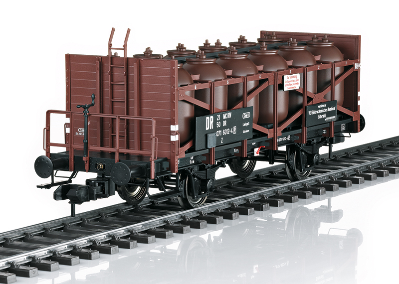 Vorbild: Säuretopfwagen mit Bremserbühne zum Transport von Salzsäure. Wagen der Deutschen Reichsbahn (DR) vermietet an die VEB ECK Bitterfeld im Zustand der Epoche IVa um 1970. Betriebsnummer 21 50 071 6012-4 P.