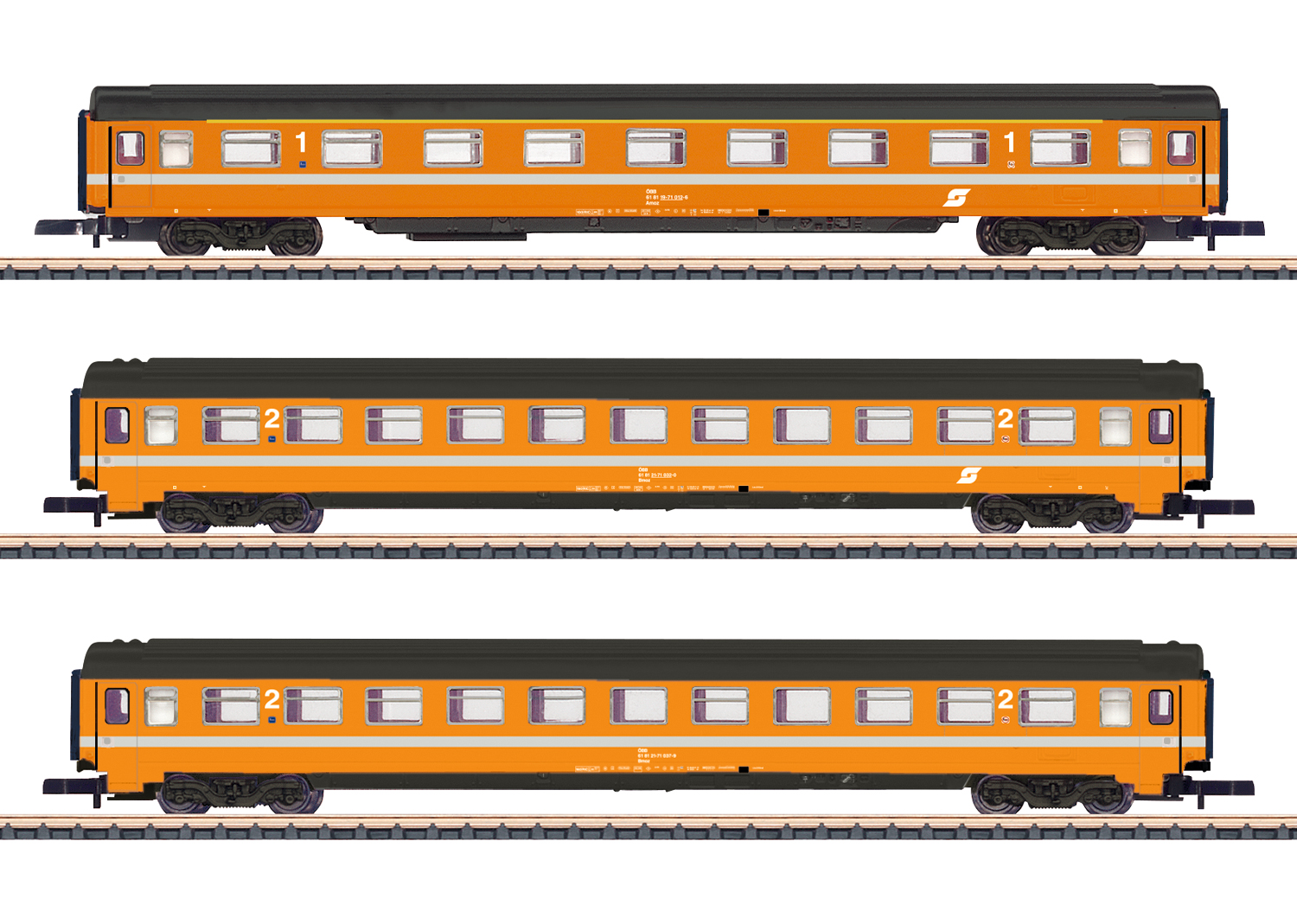 Vorbild: 3 Eurofima-Schnellzugwagen der Österreichischen Bundesbahnen (ÖBB). 1 Schnellzugwagen 1. Klasse Amoz. 2 Schnellzugwagen 2. Klasse Bmoz.