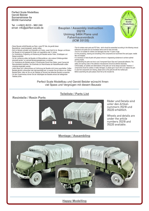 1/35 UnimogS404 Plane und Fahrerhausverdeck Kit