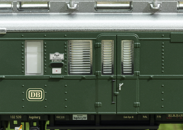 Vorbild: Fünf Reisezugwagen der Deutschen Bundesbahn (DB). Ein Gepäck-/Postwagen PwPostie, ein Durchgangswagen 1./2. Klasse ABie und drei Durchgangswagen 2. Klasse Bie. Farbgebung Flaschengrün. Betriebszustand um 1958.
