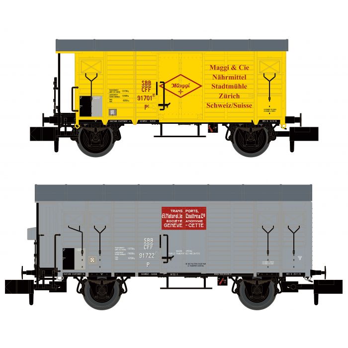 N SBB 2 gedeckte Güterwagen 1x K2 Maggi, 1x K3 Le Coultre, grau Ep. III