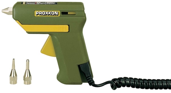 MICROMOT-Heissklebepistole HKP 220, inkl. 3 auswechselbare Metalldüsen Schnelles, zuverlässiges Kleben von Metall, Holz, Kunststoff (auch Plexiglas), Glas, Keramik, Steingut, Pappe, Leder, Schaumstoffen und Textilien. Der Kleber bindet, abhängig vom Werkstoff und der Auftragsmenge, nach 30 Sekunden ab. Innerhalb dieser Zeit sind Sitzkorrekturen möglich (Vorteil gegenüber Sekundenklebern). 7 mm-Ministicks eignen sich besonders für feine Arbeiten (Modellbau, Spielzeugherstellung, Trockenblumen, Schmuckherstellung). Gefühlvoller mechanischer Vorschub. Integrierte Abstelleinrichtung. Kurze Anheizzeit. . Technische Daten: 220 - 240 V. PTC-gesteuertes Hitzeelement für exakt 200° C. 4 Sticks 7 x 100 mm und 3 Wechseldüsen gehören dazu.