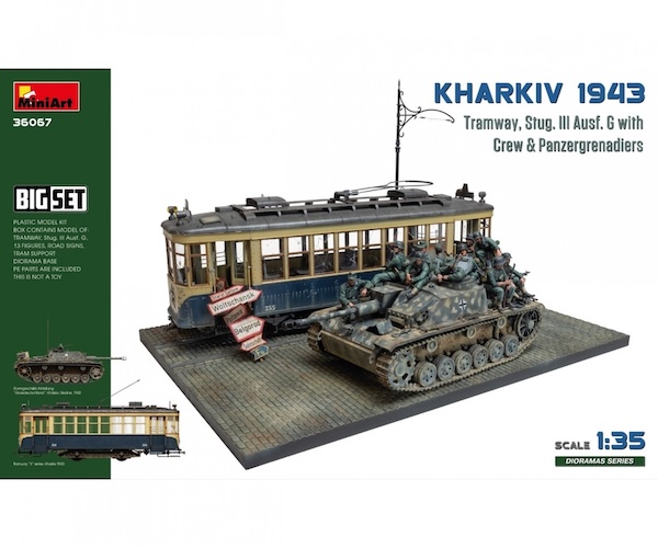 This MiniArt BIG SET captures the streets of Kharkiv during the pivotal battles of 1943. The kit includes a tram, a StuG III Ausf. G assault gun, 13 figures (crew and panzergrenadiers), road signs, and a diorama base, offering everything needed to recreate an Eastern Front scene.