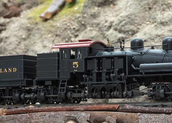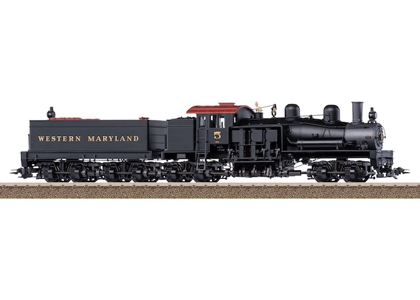 Vorbild: US-Getriebe-Dampflokomotive Bauart Shay, Class D. Ausführung mit 4 Treibdrehgestellen. Antrieb über Kurbelwellen auf Gelenkwellen und über Kegelzahnräder auf die Drehgestelle. Mit charakteristisch nach links versetztem Kessel. Überwiegend im Einsatz bei amerikanischen Feld- und Waldbahnen, auf Strecken mit engen Kurven und starken Steigungen. Western Maryland Lok-Nummer 5. Betriebszustand der 1940er Jahre.
