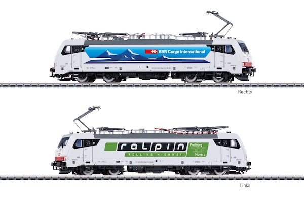 • Vorbild: Elektrolokomotive Baureihe 186 der Akiem SAS, vermietet an die SBB Cargo International. Lichtgraue Grundfarbgebung mit zwei unterschiedlich gestalteten Seitenflächen. Betriebsnummer 186 904-9 "Ceneri". Betriebszustand ab 2022.