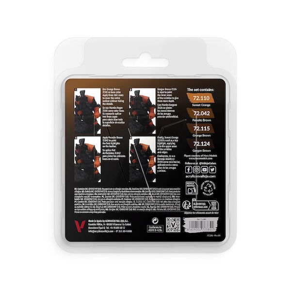 Farb-Set Sci-Fi Paint. Farb-Set aus der Model- Game-Color-Serie. Beinhaltet 12 leuchtende Farben in Fläschchen a 18 ml und eine Exklusiv- Figur, entworfen von Angel Giraldez. Mit diesem Farb-Set lassen sich endlose Details für Sci-Fi- Figuren kreieren, mit traditioneller Technik oder mit Lichteffekten. Das Set deckt die gesamte Farbpalette mit zehn Schattierungen ab und enthält zwei auch fluoreszierende Farben, mit denen reflektierende Lichteffekte erzeugt werden können. Die im Set enthaltene Figur ist aus Kunststoff und ca 28 mm groß. Mittels dem auf der Schachtel aufgedruckten QR-Code gelang man zu einer ausführlichen Video- Anleitung von Angel Giraldez.